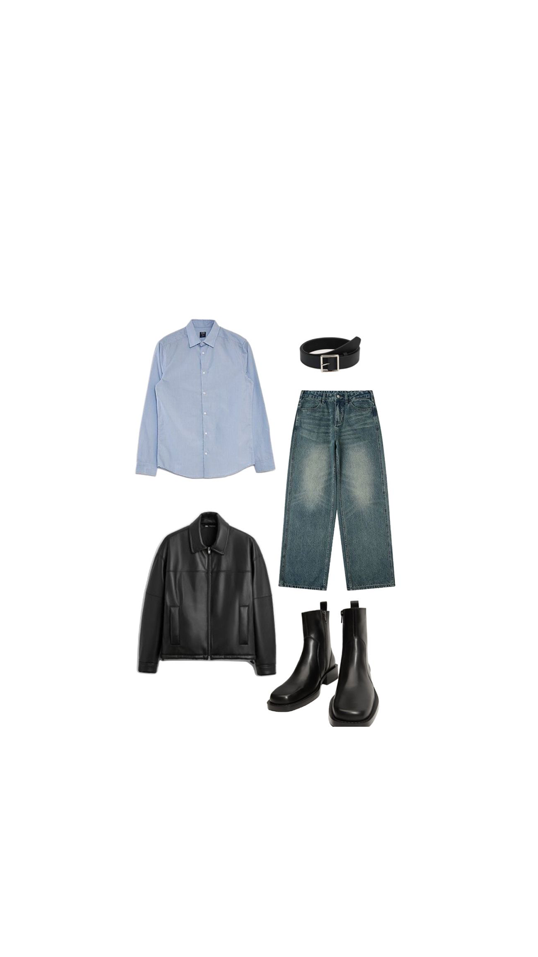 Outfit kết hợp giữa sơ mi xanh nhạt, quần jeans ống rộng wash cổ điểnáo khoác da đen, tạo nên tổng thể trẻ trung nhưng vẫn mạnh mẽ. Đi cùng chelsea boots da đen giúp set đồ thêm phần cá tính và sang hơn — đúng vibe “winter guy” mùa lễ hội. Set đồ này mang vibe ấm áp – nam tính – hiện đại, rất hợp cho dịp Giáng sinh: vừa đủ chỉn chu để đi chơi lễ, vừa đủ “cool” để lên hình đẹp.